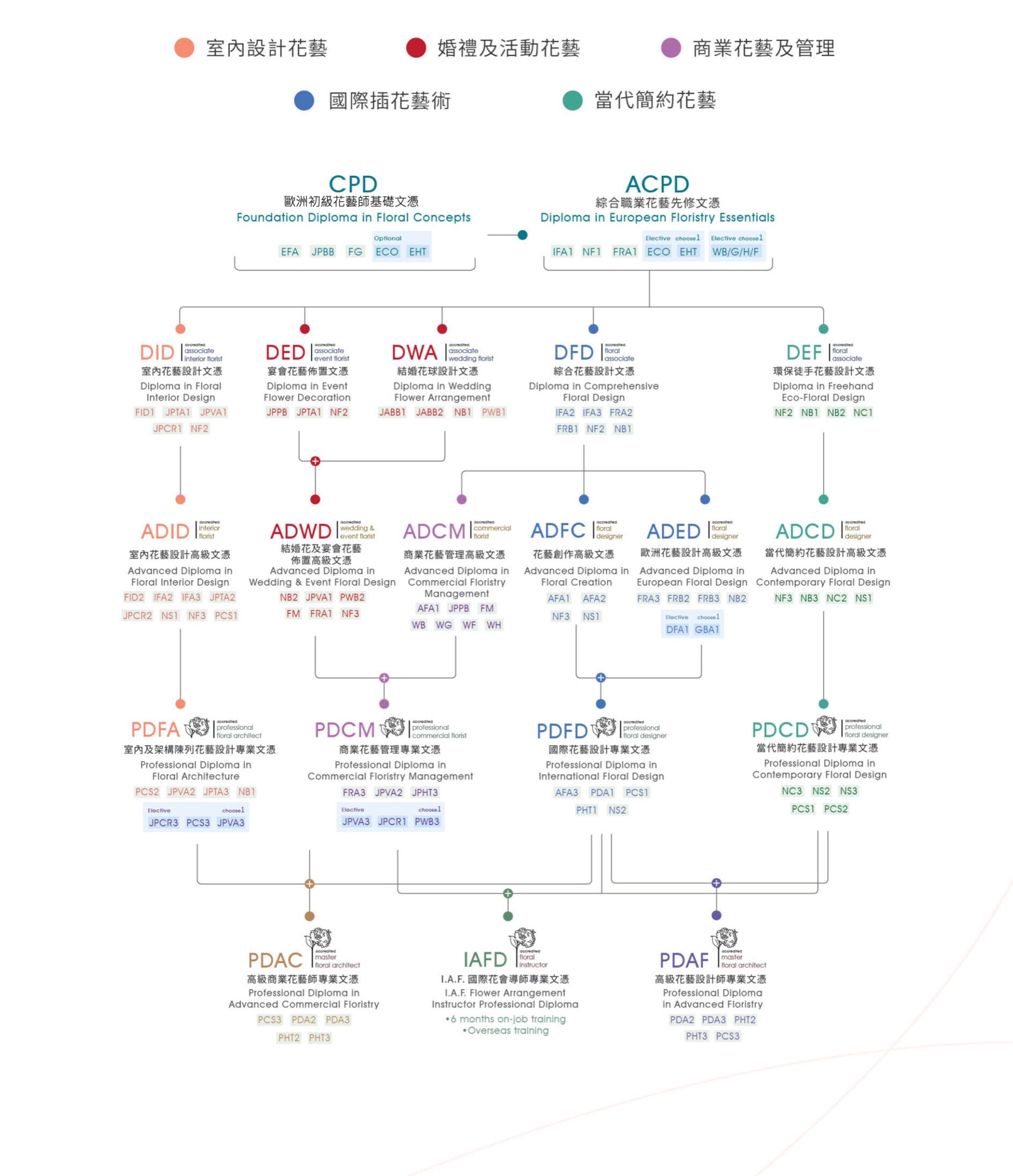 香港插花藝術學院 為了輔助學生達至行內國際水平,融合 I.A.F. 國際花會設計課程架構,學生可按照自己興趣或事業目標進修。