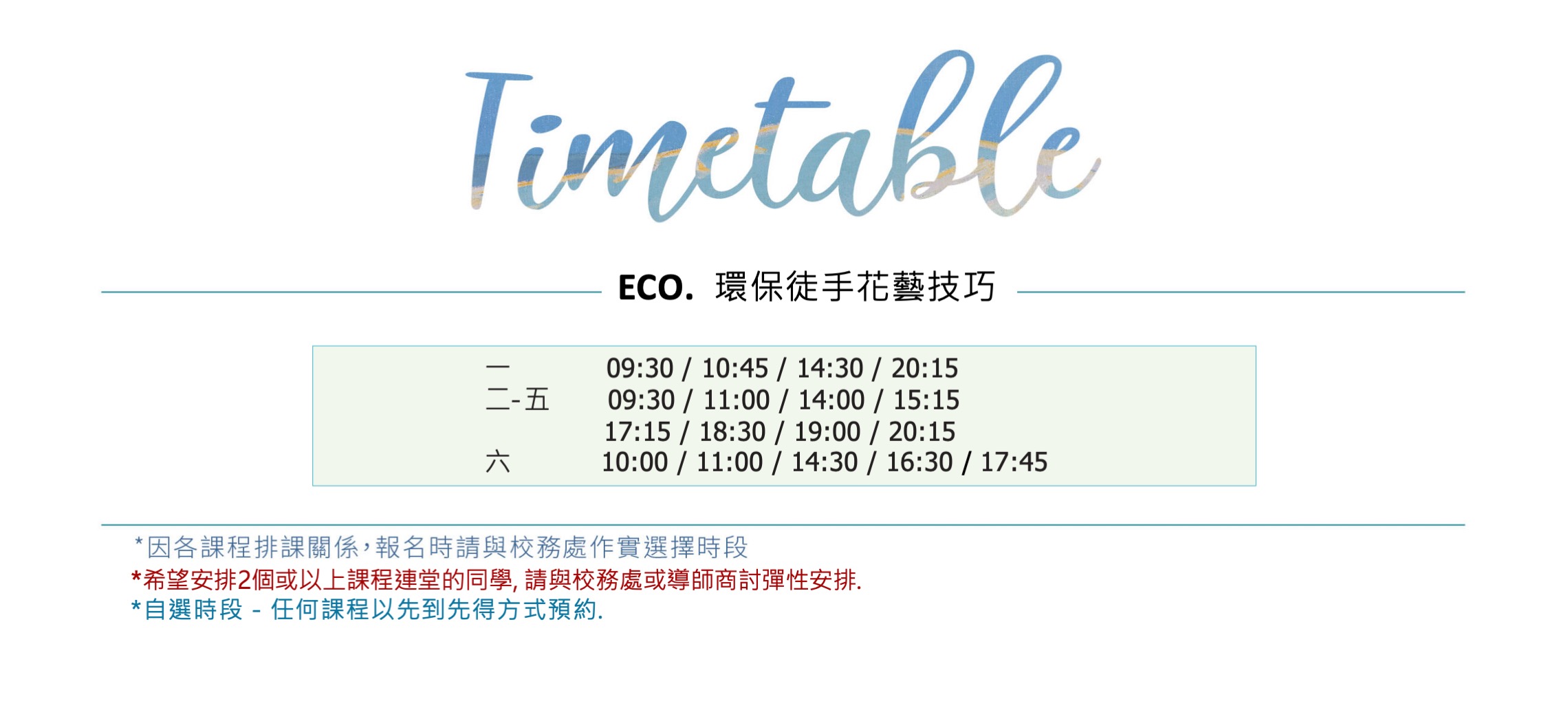 ECO. 環保徒手花藝技巧 以玻璃檯花作主題,於不需使用花泥或劍山的情況下,利用不同環保、創新又實用的技巧,在不同玻璃器皿中實踐近年盛行的自然風格的花藝設計。於家中或是辦公室擺放自己親手創作的環保花藝,點綴你的生活空間。在追求美感的同時,亦能兼顧永續的習慣。透過12款設計實例,學生可以無需依靠花泥或劍山,學習徒手插花固定各類不同軟硬/形態的花材技巧、顏色和形態的配搭,利用花朵最原始的自然型態,強調掌握花藝的架構呈現自由美態。課程重點是實用技能,學生可以扎實基礎後應用於不同的風格: 如歐洲田園風、現代自然風格、或進修 NF NUFLEUR 新派徒手簡約花藝設計。