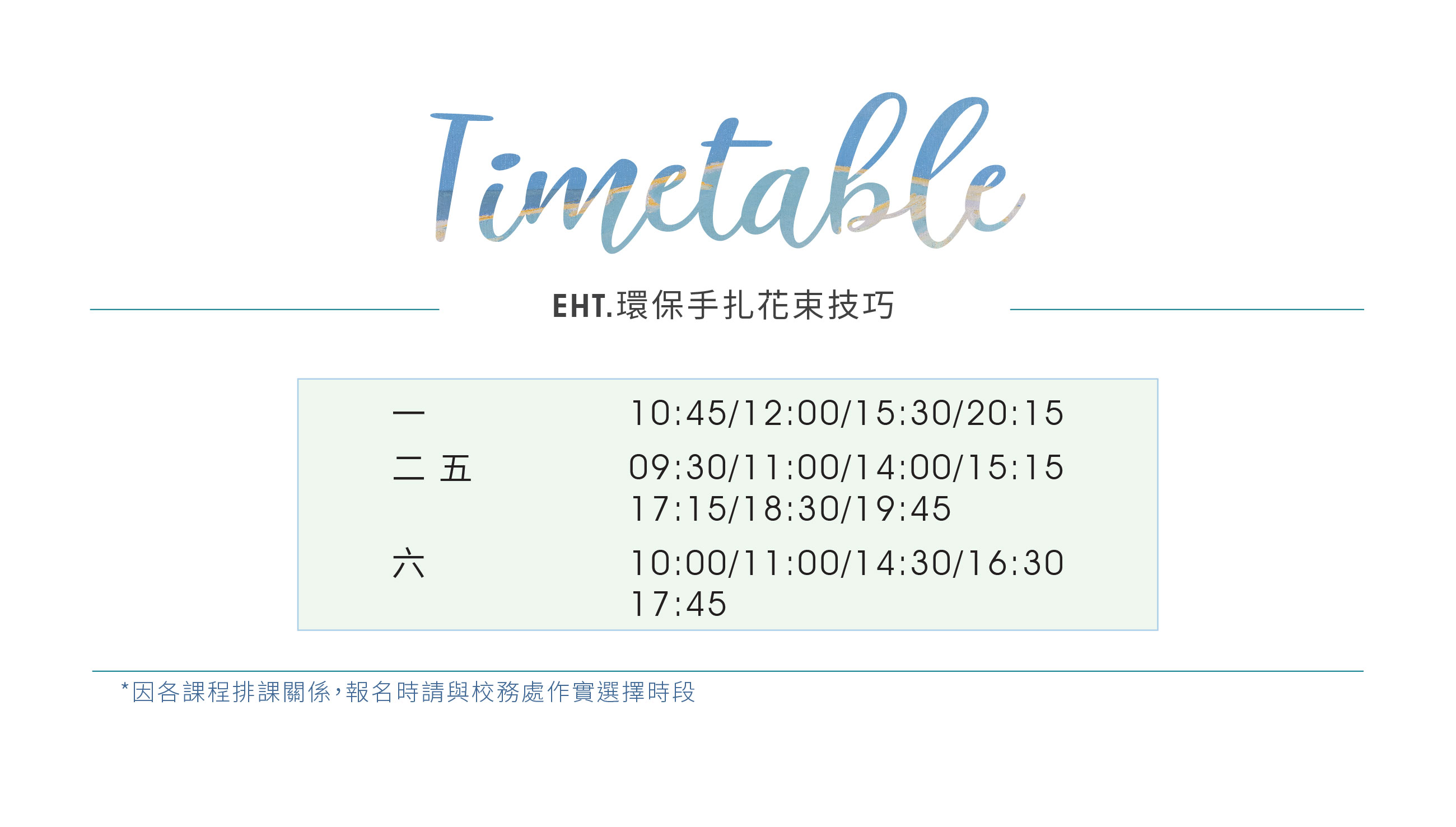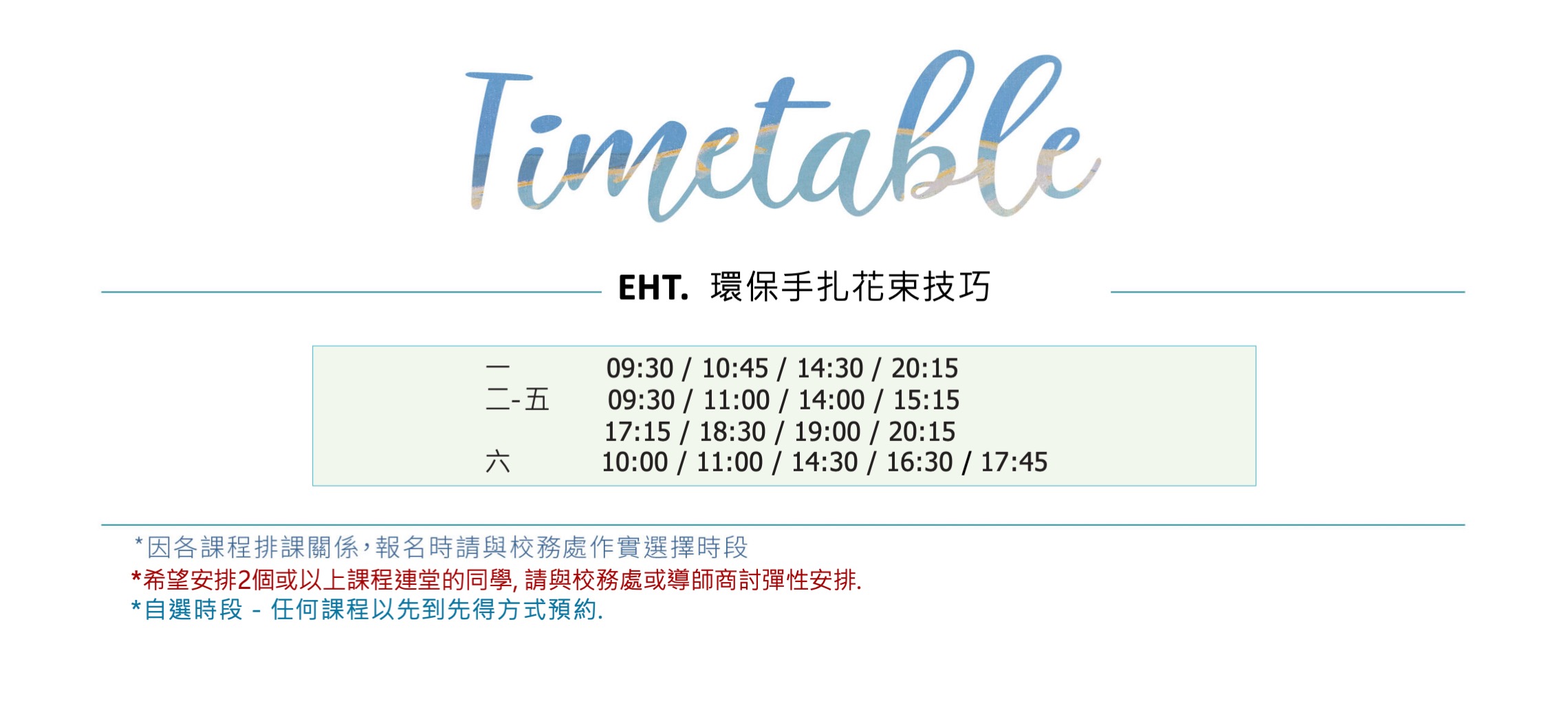 EHT 環保手扎花束技巧 – 是 Eco-floral 環保花藝系列之一。將介紹12款實用的螺旋形紮花技術和設計,強調掌握花束的架構、曲線、層次和線條感,如散形手紮花束等 – 以富空間感而又自然的方式扎作固定所有材料,熟習及鞏固螺旋手扎花束技巧。