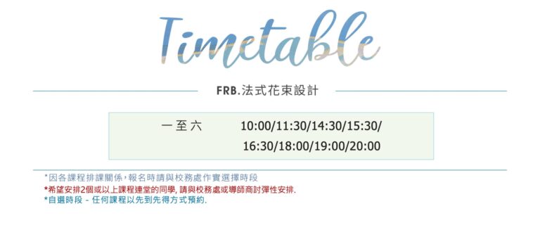 FRB. 法式花束設計課程共有三級,每級會教授16款設計,學員可透過此課程掌握法式花束藝術之設計結構。課堂設計將透過不同演譯方式製作法式花束設計、學員可發展自已獨有風格的,法式包裝花束、法式結婚花球等,也可加入花禮品構思或結婚花球技巧,發展自已獨有風格的。
