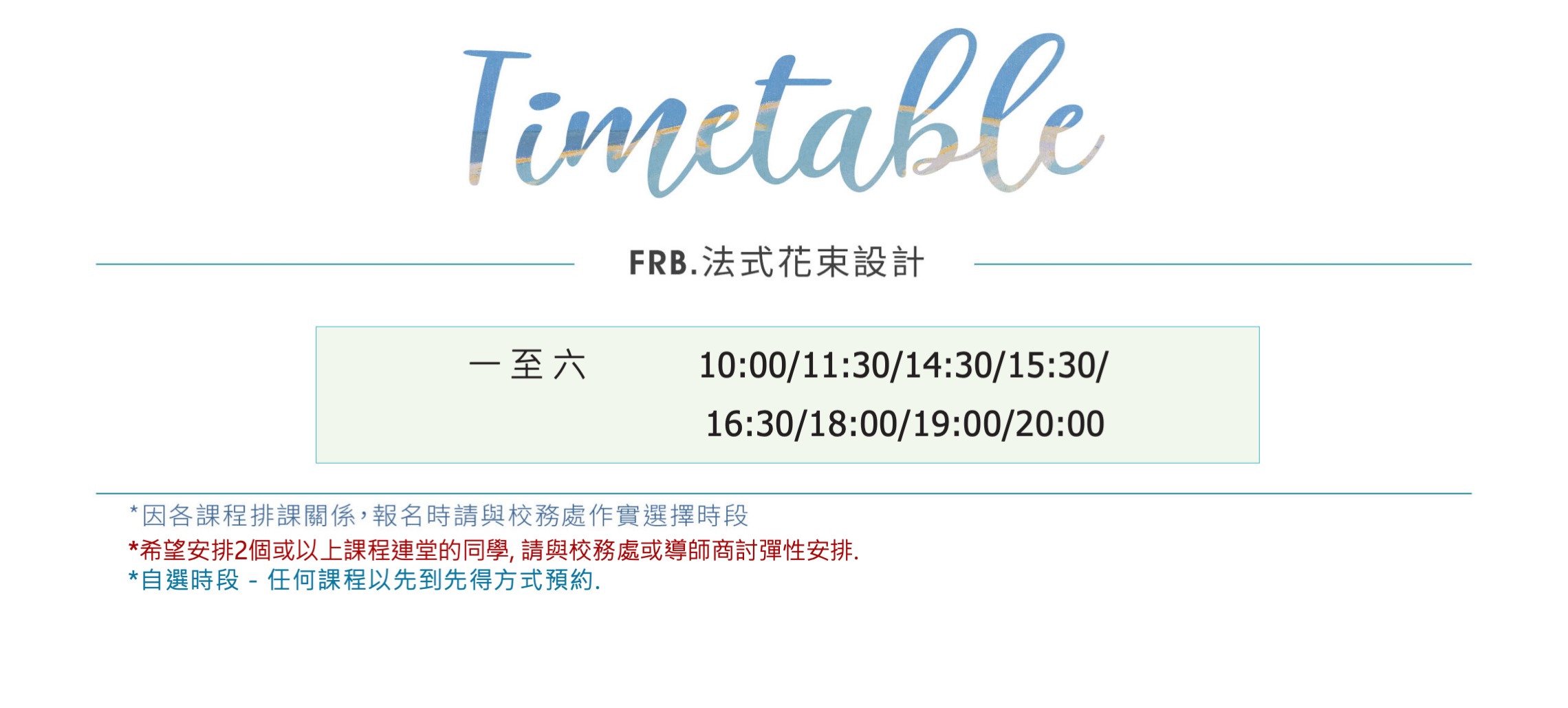 每一堂課會完成一個花藝作品,為確保花材供應,需於最少七天前預約及確認課堂日期 / 加入課程。